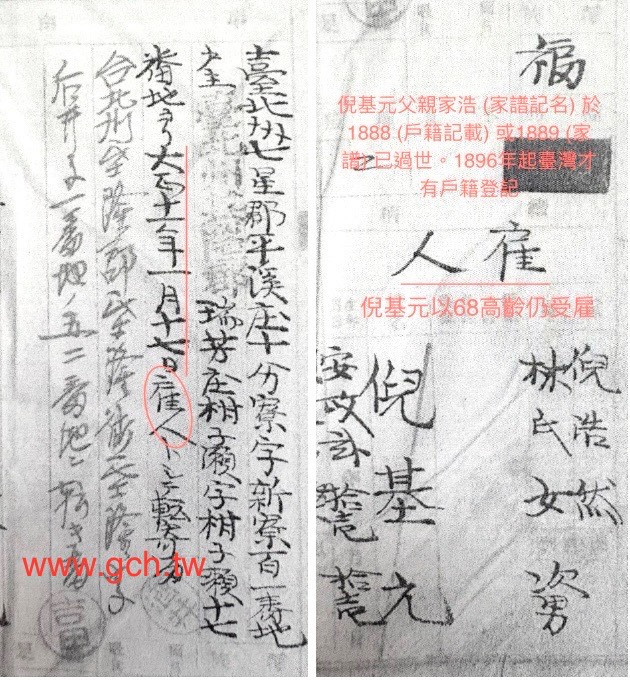 一、日治時期臺灣戶籍資料存在諸多誤寫與不實,不過,「如果」倪基元1922年此時依靠兒子倪蔣懷頤養天年,雇主不需要大費周章作登錄動作,僱約關係與僱約時間不能否認。