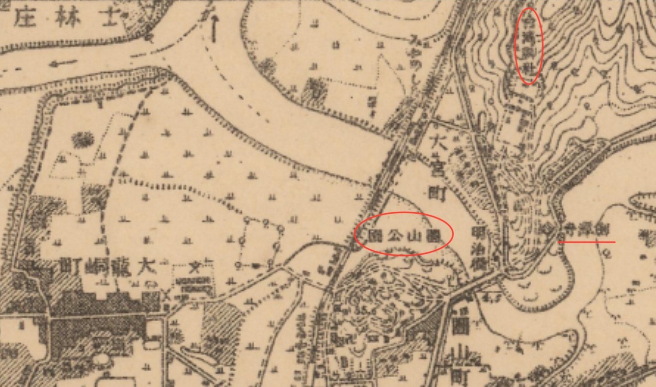 臺灣神社山下沿著河岸當時存在數座類似民宅