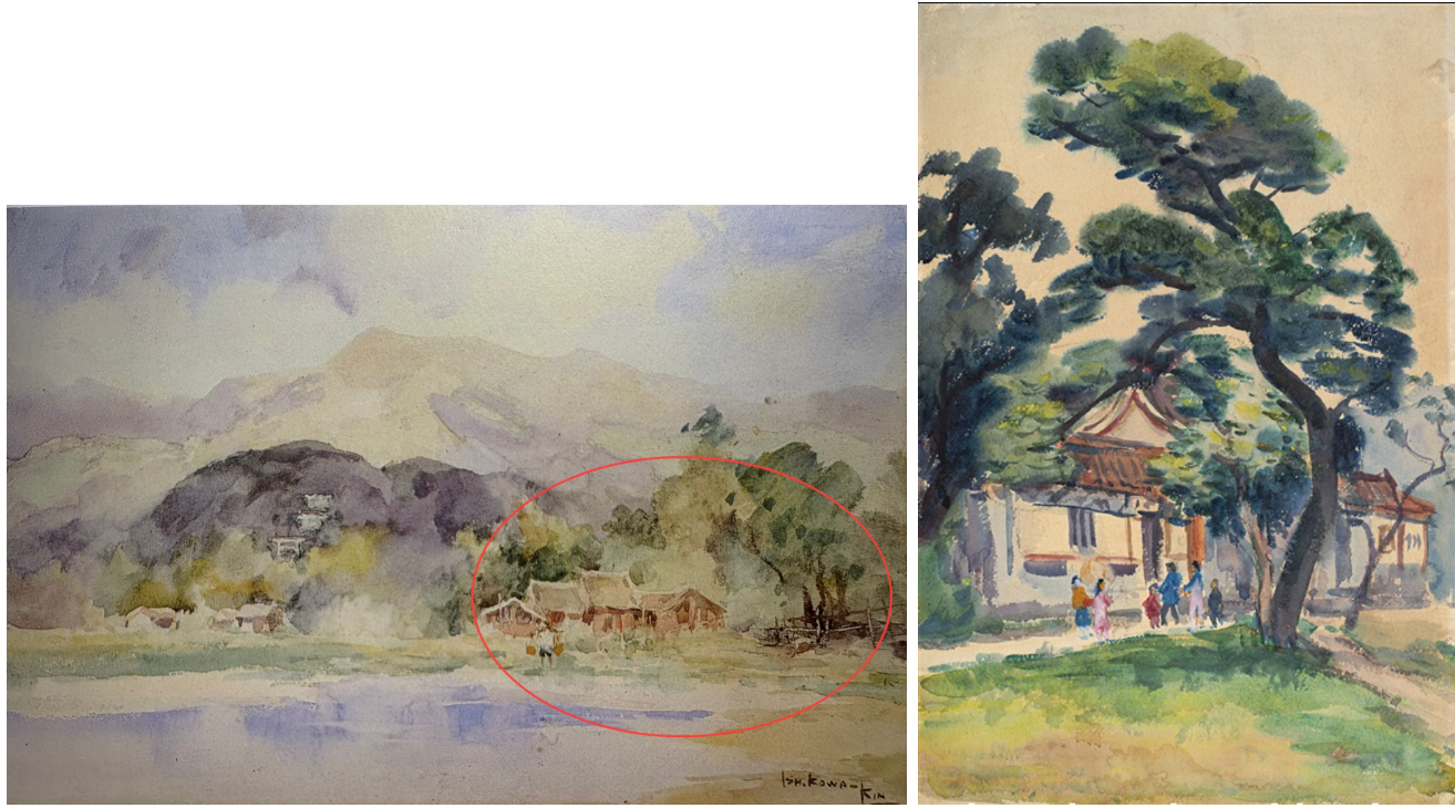 左:石川欽一郎《劍潭の風景》c. 1926 31.3 x 46.7 cm 水彩、紙 私人藏 / 畫面左:山上的神社為臺灣神社,今圓山飯店。臺灣神社山下沿著河岸當時存在數座類似民宅