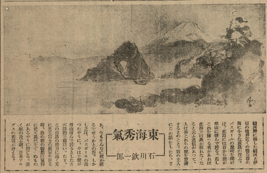 以上旅遊寫生敘述,從「春的氣息」和「新雪」推測可能是三月,很可能是投稿時間的前一年,也就是1937年3月。石川先生聚焦在海中淡島,這是此趟旅行的目的。六成篇幅敘述淡島的貍貓傳說,提起畫筆時,貍貓聯想和閃耀富士山卻在心境上產生衝突,此處石川先生提到創作時的重要因素:心境。心境是創作者的內心狀態,若無創作者親自剖白,旁人和後人皆無法代言。