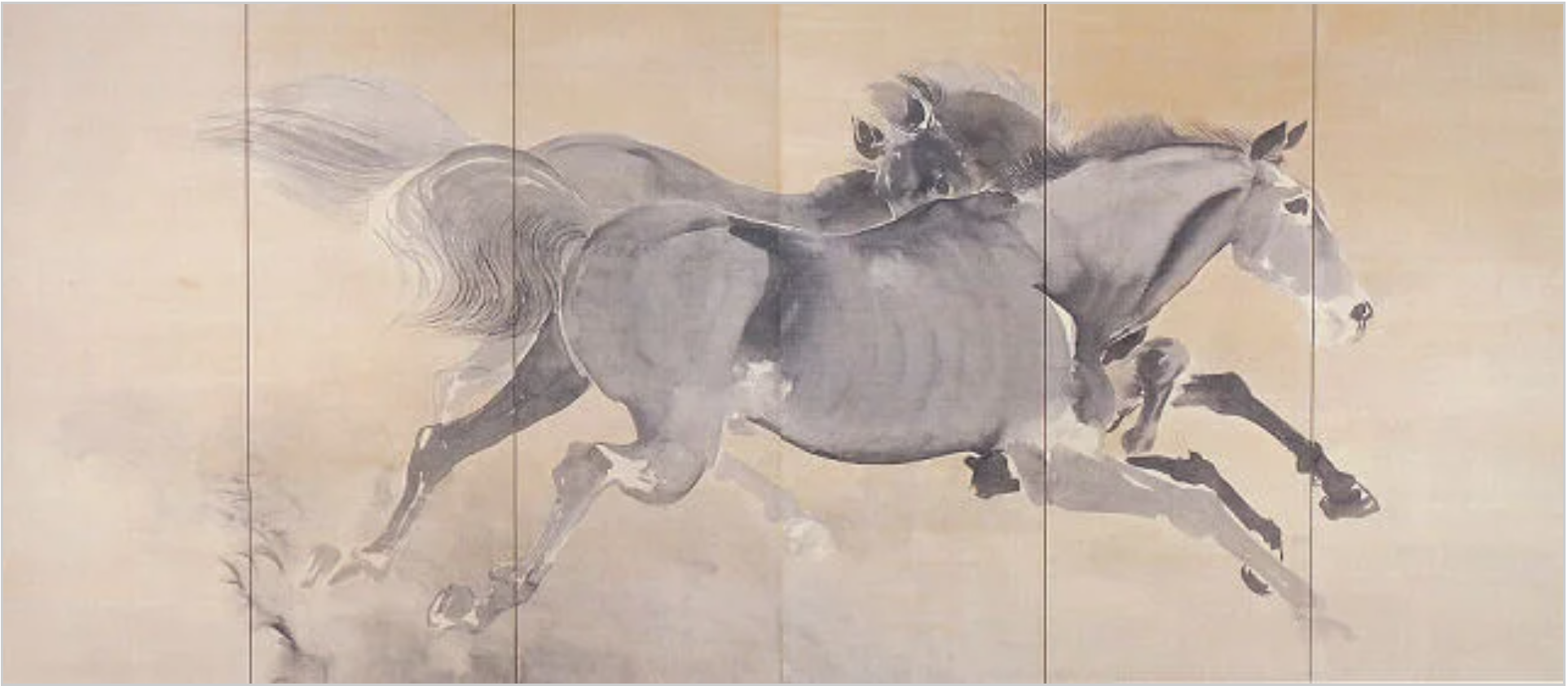 野沢如洋《奔馬三頭之図屏風》(右隻)弘前市本迹院蔵