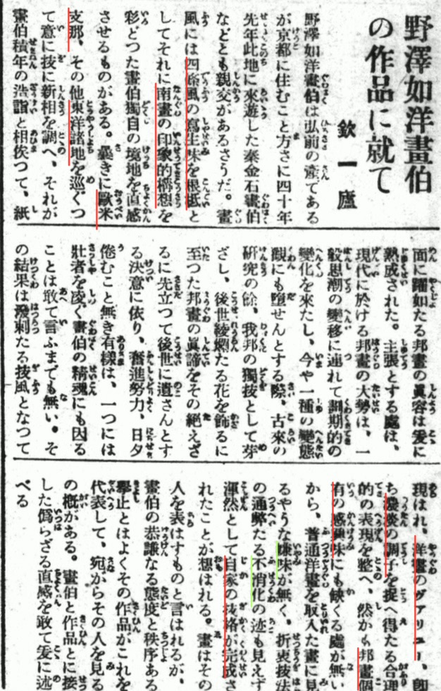 石川欽一郎:「野澤畫伯把握了西洋畫濃淡明暗的調性,整理出和諧合理的表現,同時又不缺少日本畫特有的感興與韻味」